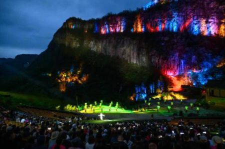 A scene from "Impression Wulong," a large-scale landscape performance, in Wulong District, Chongqing, on the evening of April 16, 2026. (Photo by He Penglei/China News Service)