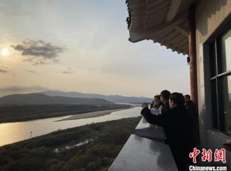 海外华文媒体一行在珲春防川登上龙虎阁远眺。 李钊 摄