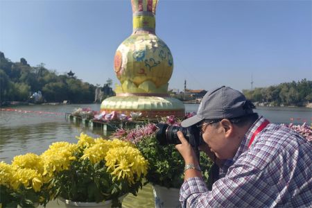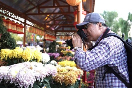 图为海外华文媒体代表在龙亭拍摄菊花。