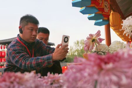 图为海外华文媒体代表在清明上河园拍摄菊花。