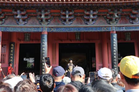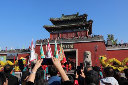 图为游客在开封府门前欣赏表演。