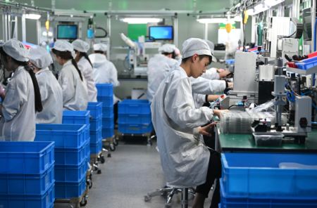 11月17日,休宁县昌辉汽车电器(黄山)股份公司的生产车间内,工人们正在组装汽车配件。中新社记者韩苏原 摄