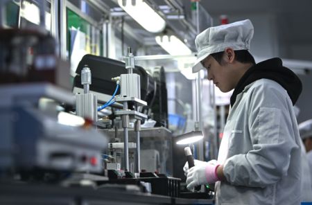 11月17日,休宁县昌辉汽车电器(黄山)股份公司的生产车间内,工人正在组装汽车配件。中新社记者韩苏原 摄