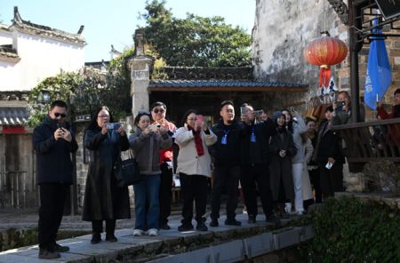 (华文媒体代表在查济古村拍摄取景。中新社记者 韩苏原 摄)