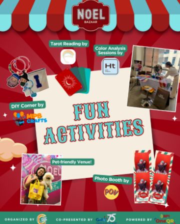 Shoppers can look forward to a packed line-up of activities: tarot reading at Soul Play by Lei, DIY souvenirs at MPB Crafts, memorable snaps at Photo Booth by POV, color analysis sessions by Hue Theory, and vintage shopping for a cause at the GMA Celebrity Ukay-Ukay booth。