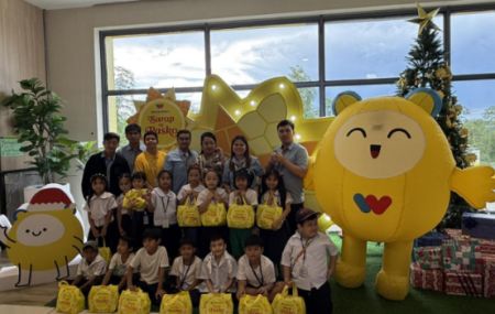Students from Makiling Elementary School receive Christmas during the Handog Pamasko distribution at WalterMart Makiling, capturing the spirit of the season。