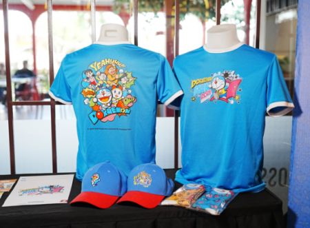 A closer look at the Doraemon Run 2026 race kit. A bright blue event shirt, collectible caps, and themed accessories designed to complete the full run-day experience for fans and runners alike。