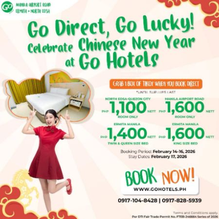 Rooms under these special promos are limited and available on a first-come, first-served basis. Don’t miss this opportunity to celebrate Chinese New Year with Go Hotels North EDSA, Go Hotels Ermita, and Go Hotels Airport Road while enjoying cozy accommodations and festive fun。