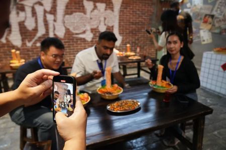 29日,参加“共享新机遇 携手向未来”——2025境外媒体看广西采访活动的东盟多国主流媒体代表、外籍网络达人走进柳州螺蛳粉产业园,感受一碗粉的魅力。