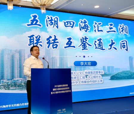 李大宏表示,今年是中國人民抗日戰爭暨世界反法西斯戰爭勝利80周年,民族危亡之際,海外華媒不畏危難,將中國抗戰的消息帶到世界各地,講述着中華民族不甘屈服的抗戰精神,如今我們接過歷史的接力棒,仍要賡續守護紅色記憶、傳遞抗戰精神的使命,要用更鮮活的敘事、更創新的形式,讓年輕一代讀懂歷史、銘記初心,把中國尊重歷史、珍愛和平的態度傳遞給世界。他表示,大文集團與海外華文傳媒合作組織願以此次湖南年會為新起點,與湖南深度交流合作、常來常往,共同推動文明傳播與交流互鑒,讓每一條湖南聲音、中國故事都能跨越山海、永續迴響。