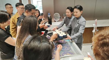刚步入参观区域,一股清甜的奶香混合着淡淡的酱香扑鼻而来。在“珍酒冰淇淋”特制展台前,体验官们被这款“可以吃的白酒文创”所吸引。大家手持印有珍酒LOGO的甜筒,好奇地品尝这一“冰火交融”的创新产品——绵密的冰淇淋中融入了醇厚的酱香风味,既有奶油的清甜,又有白酒的余韵。“这太不可思议了!”一位媒体记者惊叹,“没想到烈酒还能这样‘温柔’地入口。”