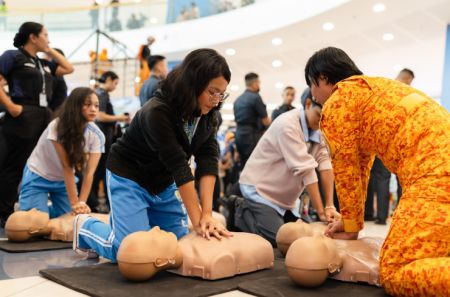 A woman BFP firefighter teaches Hands-Only CPR to young students during the Fire Square Road Show at SM Mall of Asia Music Hall on March 3, underscoring the importance of education and community awareness in building a safer, more prepared future。