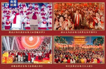 年味正浓,新春的喜庆氛围不断铺展。黑龙江哈尔滨分会场唱响《冰雪暖世界》,尽显“东北老铁”的热情豪爽和冰天雪地的别样温情;浙江义乌分会场欢庆《世界义乌中国年》,成龙与Lionel Richie(莱昂纳尔·里奇)等多国艺术家同唱一首歌,音符间流淌着义乌“广交天下客”的滚烫热情;安徽合肥分会场黄梅戏、徽州三雕、手龙舞等非遗元素融入《合韵满江淮》,低空飞行器与地面表演组成“天地矩阵”,突显向新而行的磅礴气势;四川宜宾分会场在民俗活动“请春酒”中热闹开场,三江六岸全民欢歌,微光汇成星河,勾勒出长江上游城市的幸福图景。