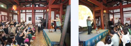 随后,国家级非物质文化遗产提线木偶戏登场,木偶在艺人手中做出骑自行车、弹吉他、跳舞等动作,引来阵阵掌声。互动环节中,大家手持“四宝”,通过手腕快速振动使竹片互击发声,模拟琵琶指法,配合旋律节奏。意犹未尽的嘉宾们还登上舞台,在木偶艺人的指导下,有模有样地操纵起提线木偶,玩得不亦乐乎。泉州本地旅行商也来到现场,大家畅谈各自国家的传统表演艺术,就入境游线路开发、文化体验产品设计等事项交流洽谈。