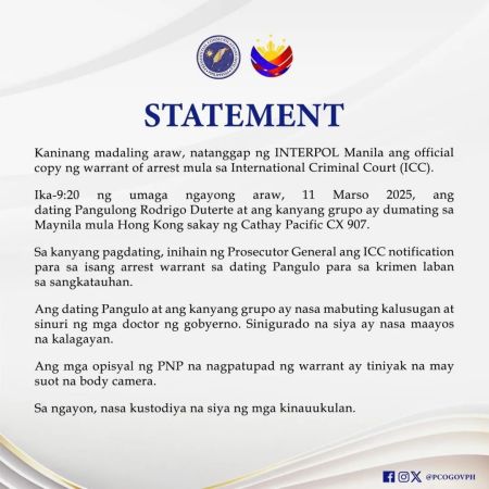 這份逮捕令是通過馬尼拉國際刑警組織收到的,在杜特地從香港返回時送達。