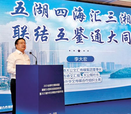 李大宏對湖南方面給予香港大公文匯傳媒集團和海外華文傳媒合作組織的支持表示感謝。他表示,湖南的發展為香港及海外華文傳媒講好中國故事提供了源源不斷的素材。“我們深深感受到湖南‘拔節生長’的強勁脈動,也感受到湖湘大地對海外華文媒體的真摯情誼。”李大宏以“同聲”“同創”“同根”三個“同”回應這份感受。他說,同聲,能讓世界聽得見湖南拔節的聲音;同創,能讓世界觸得到湖南開放的接口;同根,能讓湘情與鄉情長在一起。