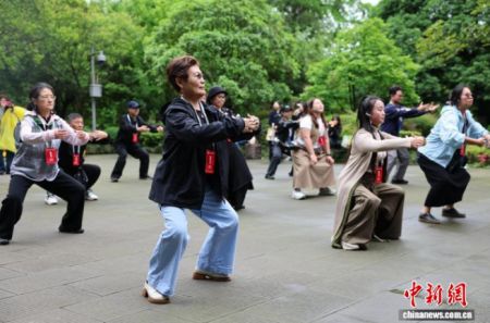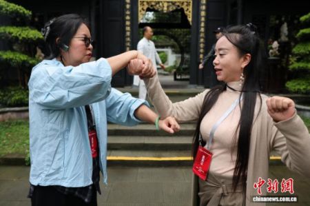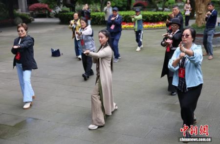 4月13日,来自全球17个国家和地区的20余家海外华文媒体代表走进四川都江堰,参观2000余年历史的水利工程、体验青城武术。图为华文媒体代表学习体验青城武术。中新社记者 张浪 摄