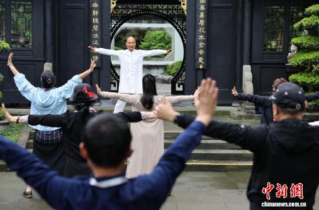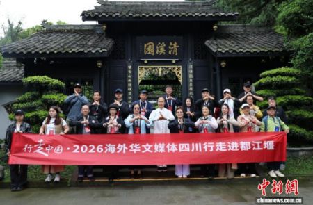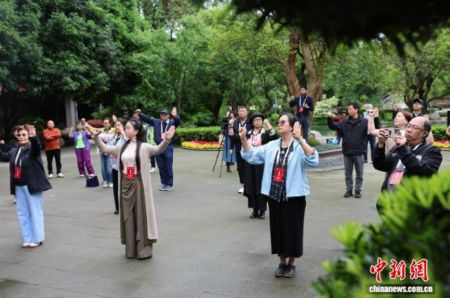 4月13日,来自全球17个国家和地区的20余家海外华文媒体代表走进四川都江堰,参观2000余年历史的水利工程、体验青城武术。图为华文媒体代表学习体验青城武术后合影。中新社记者 张浪 摄