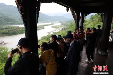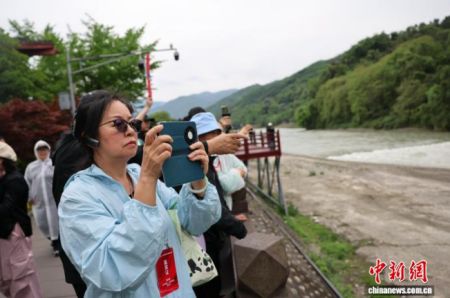 4月13日,来自全球17个国家和地区的20余家海外华文媒体代表走进四川都江堰,参观2000余年历史的水利工程、体验青城武术。图为华文媒体代表参观都江堰水利工程。中新社记者 张浪 摄