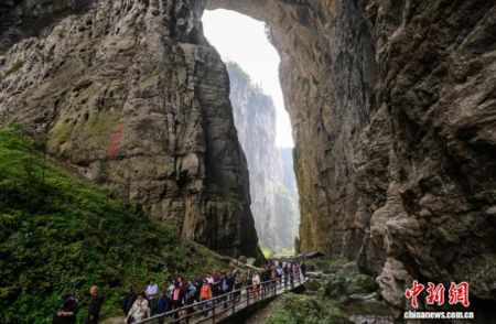 图为武隆天生三桥景区游人如织。中新网记者 何蓬磊 摄