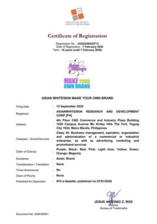 Asianwhiteskin Research & Development / Manufacturer announces the successful reclaiming of its tagline “Create Your Own Brand / Make Your Own Brand” as a registered trademark in the Philippines, with broader recognition including Japan. As a pioneer in the local food health and beauty supplements and skincare manufacturing space, Asianwhiteskin has long championed brand customization and ownership, and this milestone reinforces its leadership in safeguarding intellectual property while supporting partners who seek to build their own brands。