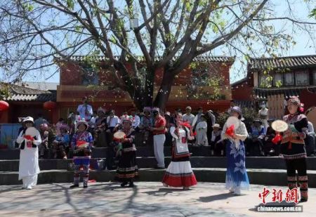 4月11日,四川省攀枝花市仁和区迤沙拉村,游客和村民跳起羊皮鼓舞。王磊 摄